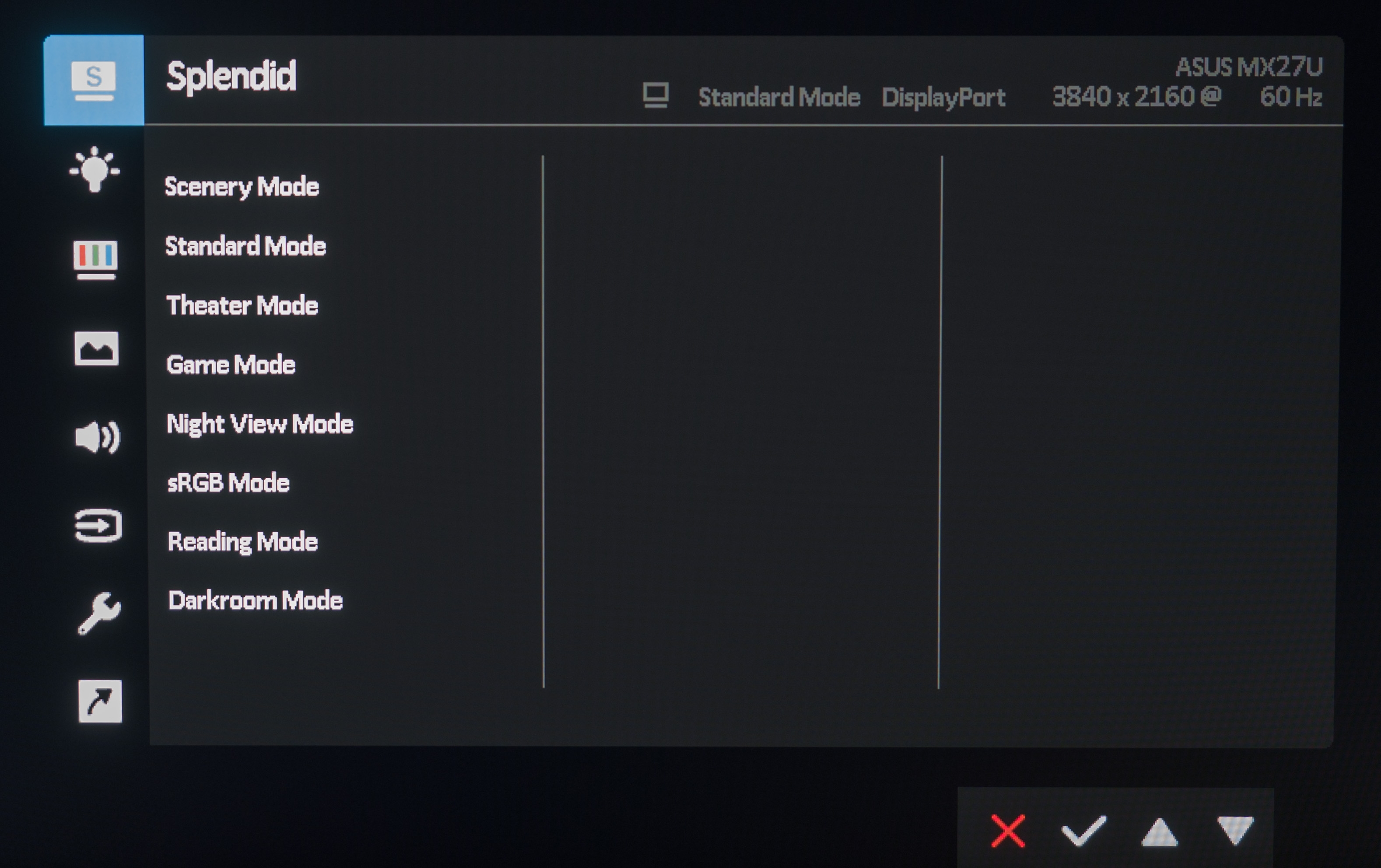 Дизайн меню претерпел некоторые изменения, но в целом большая часть пунктов осталась на своих местах. Визуально меню выглядит просто, лаконично и современно. В нём содержится восемь разделов. Первым идет раздел Splendid, в котором сосредоточены все предустановленные режимы изображения. По умолчанию выставлен пресет с названием Standard — по качеству картинки и возможным настройкам он является оптимальным среди всех доступных.