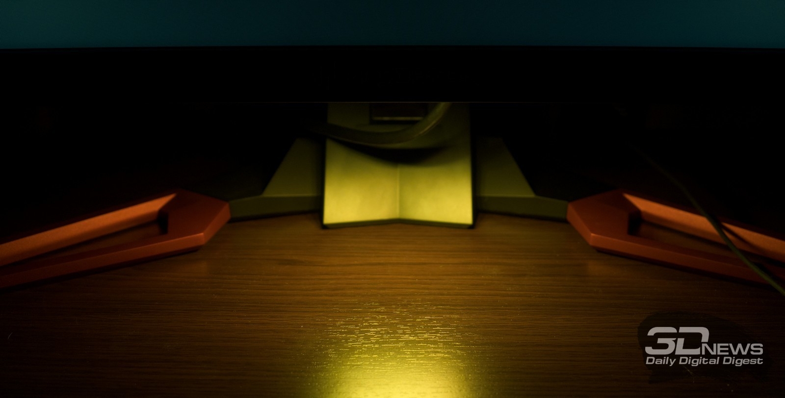 Для расширения списка особенностей производитель, как и в модели Acer XR341CK, применил ленту из светодиодов, скрывающуюся за полуматовым пластиком на нижней грани устройства. Правда, в этот раз количество светодиодов и расстояние между ними явно меньше, а эффект от подсветки слабее.