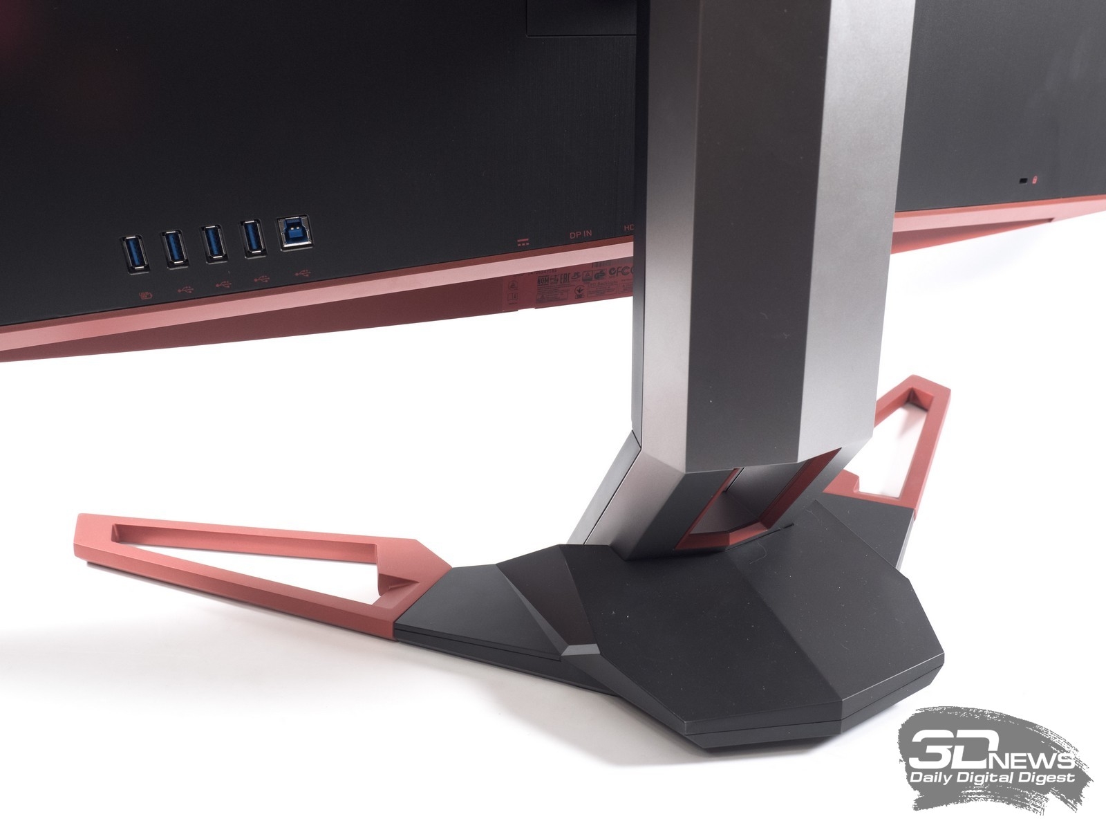 Модель выполнена в соответствии с новой концепцией дизайна серии Predator. Подставка, несмотря на внешнюю схожесть с тем, что мы видели в Predator XB1, отличается иным принципом сборки, а эргономическая составляющая упрощена: доступны только наклон и изменение высоты. За потерю возможности поворота и разворота в портретный режим производитель решил «извинится» с помощью установки светодиодной ленты подсветки на нижней грани корпуса.