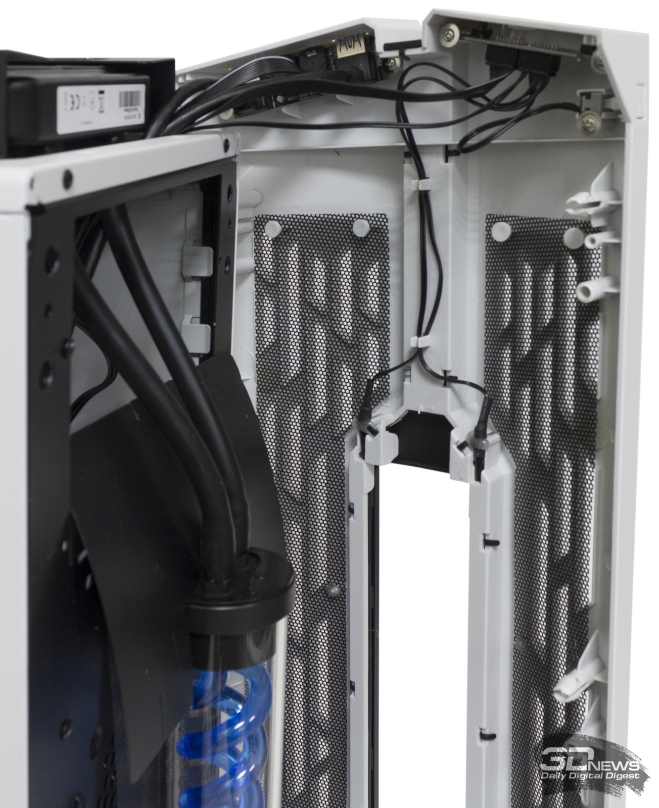 В собранном виде корпус смотрится достаточно эффектно, но не можем не отметить, что подсветка и управление ею реализованы не самым лучшим образом. Яркая подсветка вентиляторов не отключается вовсе (что порой мешает ночью), а «дышащая» подсветка крышки помпы и особенно «двойной спирали» на передней панели, напротив, слишком невзрачна (то, что последняя вообще функционирует, в солнечной комнате обнаружить проблематично, но даже в темноте эффект смотрится довольно бледно).