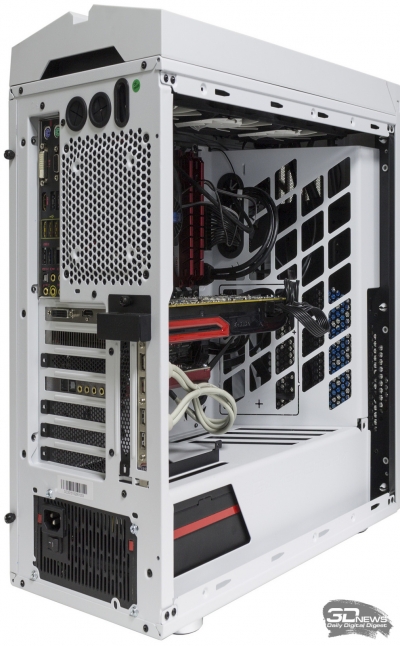 В задней части корпуса размещены вытяжной вентилятор диаметром 120 мм и стандартные семь слотов расширения, а также два опциональных вертикальных слота.