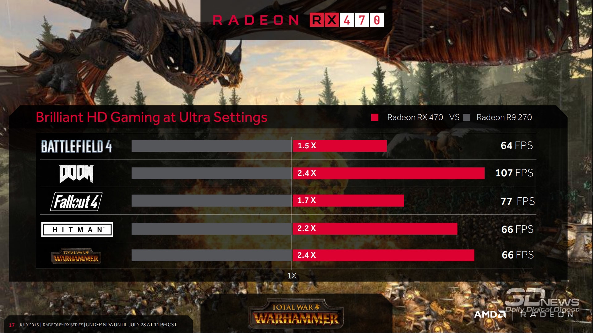 AMD обещает, что Radeon RX 470 будет примерно вдвое производительнее Radeon R9 270. Приведённые ниже значения fps характерны для связки RX 470 с 8-ядерным процессором Core i7-5960X.