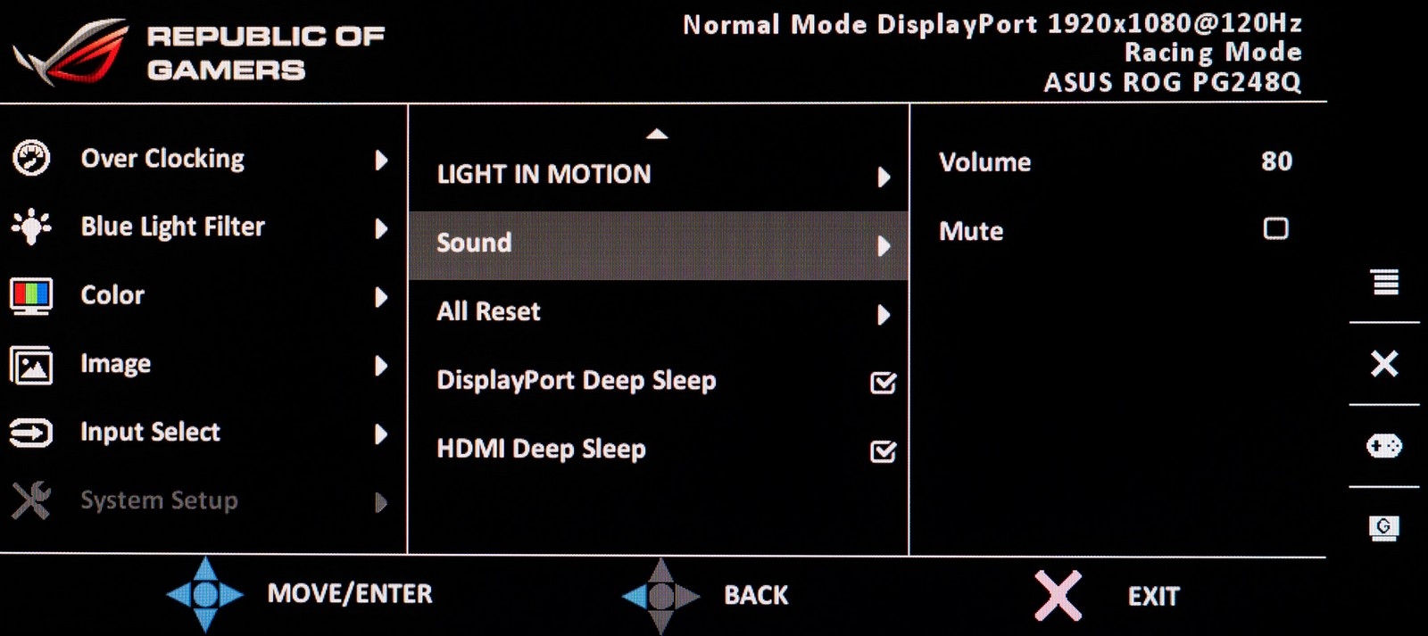 Присутствует подраздел с основной рабочей информацией по монитору и функция сброса всех (!) настроек меню к значениям по умолчанию. Возможна деактивация глубокого сна при работе монитора с HDMI- и DP-портами. В этом случае после ухода в сон PG248Q при нажатии клавиши на клавиатуре или взятии мышки в руку выходит в рабочий режим буквально за полсекунды. Доступ в сервисное меню найден не был.