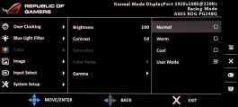 Изменить яркость, контрастность, цветовую температуру, гамму и насыщенность можно в разделе Color. От настроек тона кожи и прочих ненужных функций инженеры ASUS избавились.