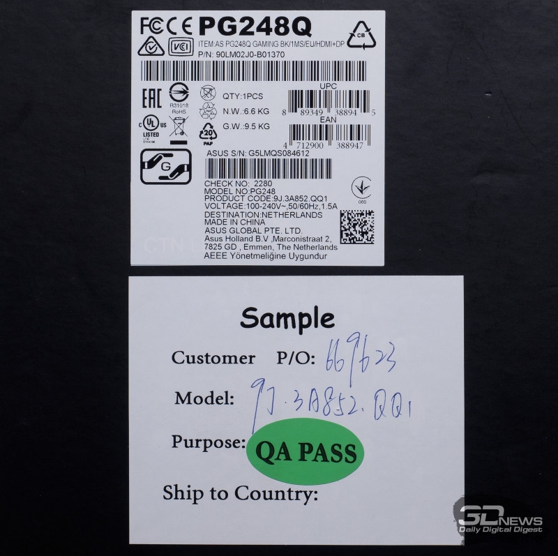По двум наклейкам в нижней части корпуса нам стало известно, что попавший к нам экземпляр ASUS PG248Q был изготовлен в мае этого года силами известного подрядчика QISDA. Данных о версии дисплея найдено не было.