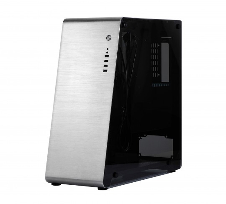 Дело в том, что фронтальная часть новинки имеет наклон. В верхней секции лицевой панели можно обнаружить по два порта USB 3.0 и USB 2.0, а также гнёзда для наушников и микрофона. Боковые стенки корпуса выполнены прозрачными, что позволяет любоваться установленными компонентами. Основной материал — алюминий.