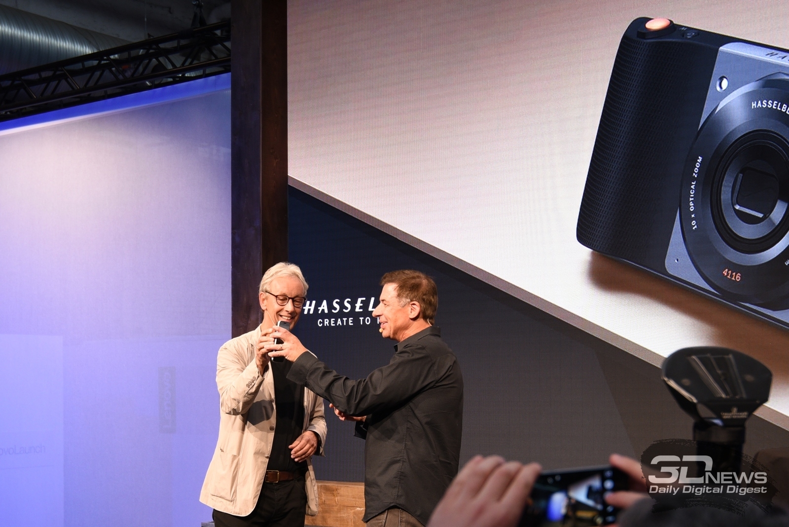 Представители компаний Lenovo и Hasselblad «чокаются» фотомодулем и смартфоном