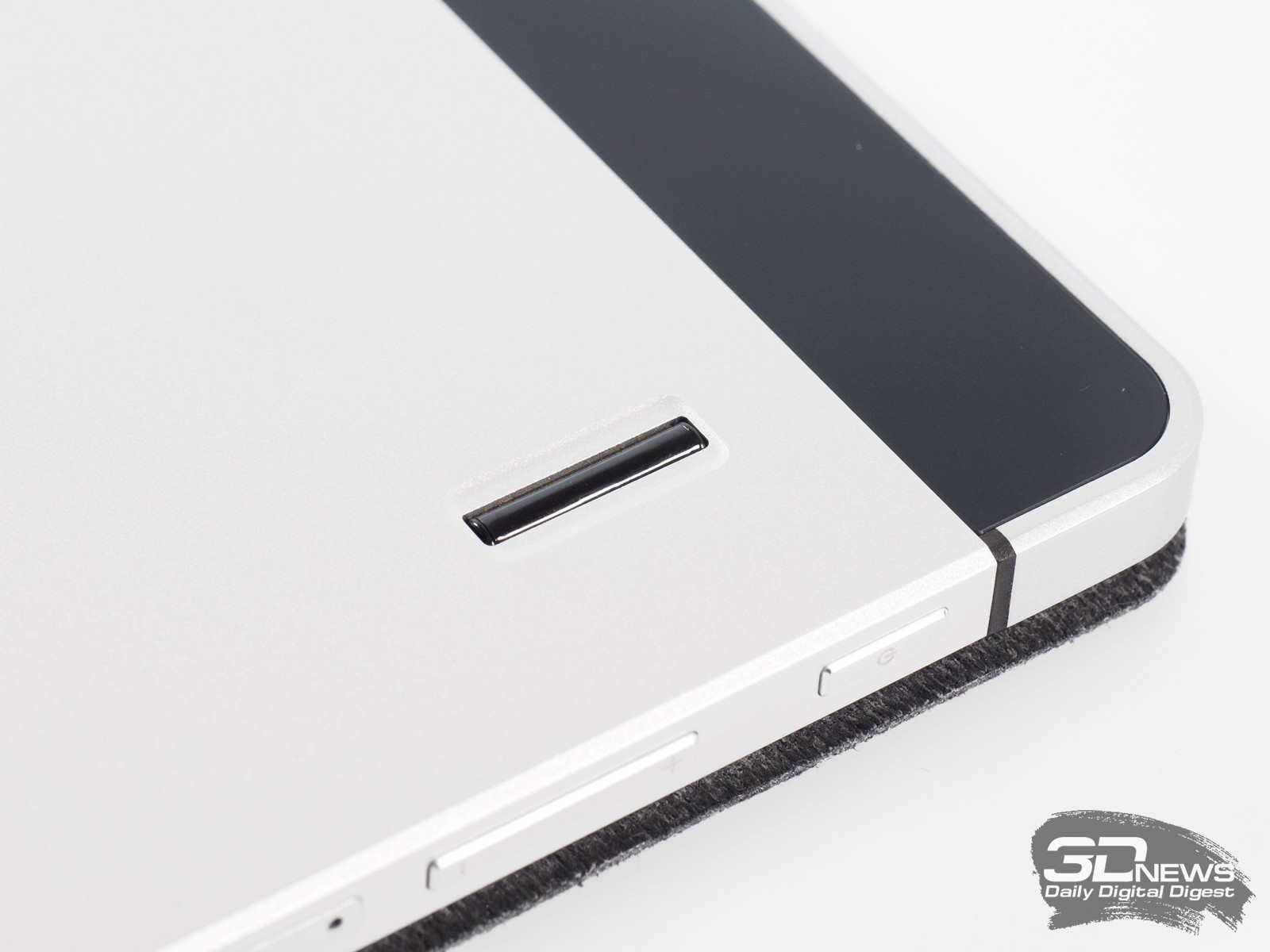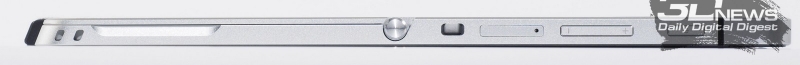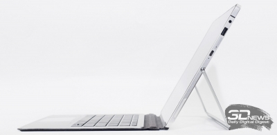 Так же можно увидеть слот для карт памяти типа microSD/SDHC/SDXC объёмом до 200 Гбайт, слот для microSIM, клавишу включения со встроенным светодиодом, качельку регулировки громкости, контактную группу для подключения клавиатурного блока и отверстие для крепления удерживающей стилус верёвочки. Для удобства раскрытия подставки с двух сторон устройства производитель сделал специальные скосы на корпусе.