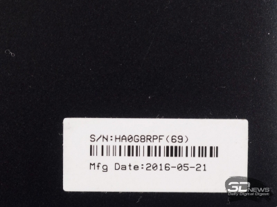 На нижней ровной поверхности нет ничего, кроме нескольких стикеров. Новинка не требует принудительного охлаждения, а потому никаких ножек и высверленных отверстий для притока холодного воздуха мы с вами не увидим.