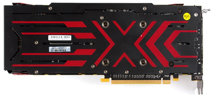 На тыльной стороне платы имеется усилительная пластина. Среди прочего, карта оснащена тремя видеовыходами DisplayPort 1.4, единичными HDMI 2.0b и Dual-Link DVI-D. Питание узлов PCB обеспечивается контактами разъёма PCI Express x16 (до 75 Вт) и 8-контактным гнездом PCI-E Power (до 150 Вт) у края платы. Последний свидетельствует о применении нереференсной PCB, правда, производитель умалчивает о том, сколько фаз приходится на графический процессор и сколько на буферную память.