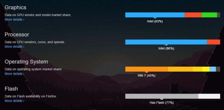 p>Компания Mozilla обнародовала свежую статистику по «железу» и ПО в компьютерах, с которых выходят в Интернет посредством ПК-версий браузера Firefox. Это далеко не первый пример, когда разработчики софта, используя встроенные в их продукты средства телеметрии, раскрывают данные о наиболее популярных среди пользователей конфигурациях оборудования. Подобную информацию регулярно публикуют Valve и Unity, но в этих примерах основной аудиторией выступают геймеры, обладающие, как правило, более мощными, чем в среднем по рынку, системами. С этой точки зрения приложение веб-обозревателя как инструмент сбора информации обеспечивает более репрезентативную выборку.