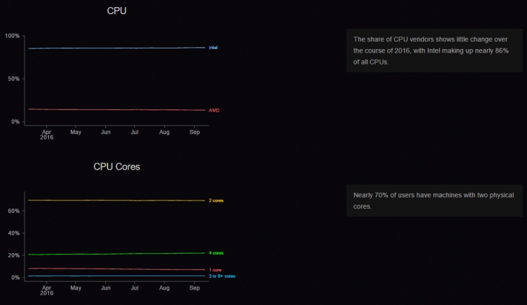 Наиболее часто встречающееся число ядер CPU — два: таких решений аналитики Mozilla насчитали почти 70 %. Самые распространённые частоты чипов — от 2,3 до 2,69 ГГц, на них работает почти четвёртая часть всех процессоров, попавших в исследование.