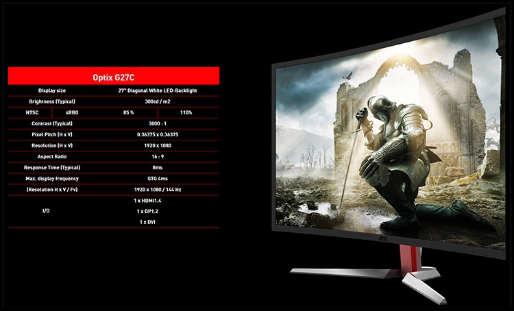 Итак, что же представляет собой MSI Optix G27C? Это 27-дюймовый изогнутый монитор, характеризующийся радиусом кривизны панели 1800R (1,8 м), 85-процентным охватом цветового пространства NTSC, частотой обновления 144 Гц и углами обзора 178°/178°. Разрешение экрана новинки составляет 1920 × 1080 точек (шаг пикселя — 0,364 мм), максимальные уровни яркости и контрастности соответственно равны 300 кд/м² и 3000:1. Время отклика Optix G27C при переходе от серого к серому составляет 4 мс, от чёрного к белому — 8 мс. Для получения видеосигнала могут использоваться интерфейсы DisplayPort, HDMI и DVI-D.
