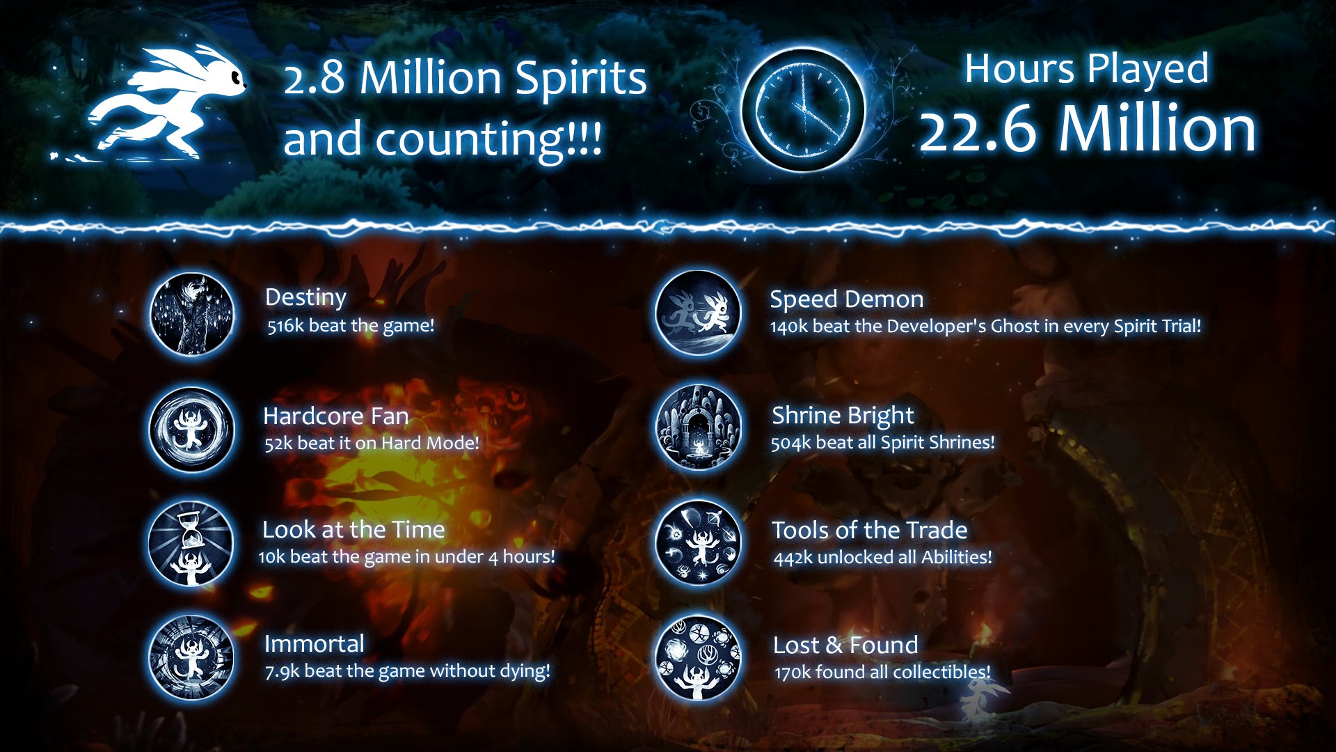 «2,8 млн духов, и это ещё не предел! Разблокировка какого достижения принесла вам наибольшее удовлетворение? Спасибо всем свободным духам за принятие истории Ори и Ку», — поблагодарили игроков разработчики.