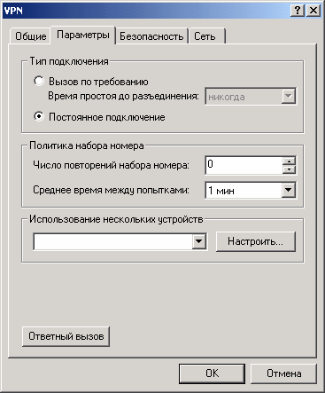13. Выберите пункт "Постоянное подключение", этот параметр необходим для создания автоматического подключения. Здесь же можете установить настройки для попыток переподключения.