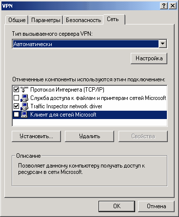 15. Снимите галки со "Служба доступа к файлам и принтерам сетей Microsoft" и "Клиент для сетей Microsoft", в параметрах "Тип вызываемого сервера VPN" рекомендуется выбрать необходимый протокол.