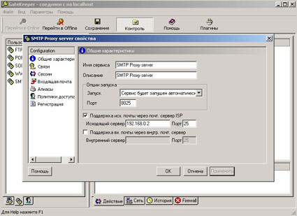 2. Далее выбираем настройки SMTP Proxy server. В появившемся меню SMTP Proxy server свойства, в закладке Общие вводим в поле Порт номер порта, пусть он будет 8025, дабы исключить конфликт, если уже установлен отдельный почтовый сервер на 25 порту, а пользователям хочется работать с внешними ящиками. Ставим флажек на Поддержка исходящей почты через почтовый сервер ISP, в поле Исходяший сервер вписываем IP адрес майл-сервера своего провайдера, а в поле Порт номер порта 25. Снимаем флажек с Поддержка вх. почты через внутренний сервер.
