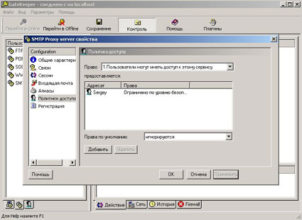 4. Идем в закладку Политики доступа. Добавляем пользователей. В выпадающем меню Права по умолчанию , выбираем игнорируются.