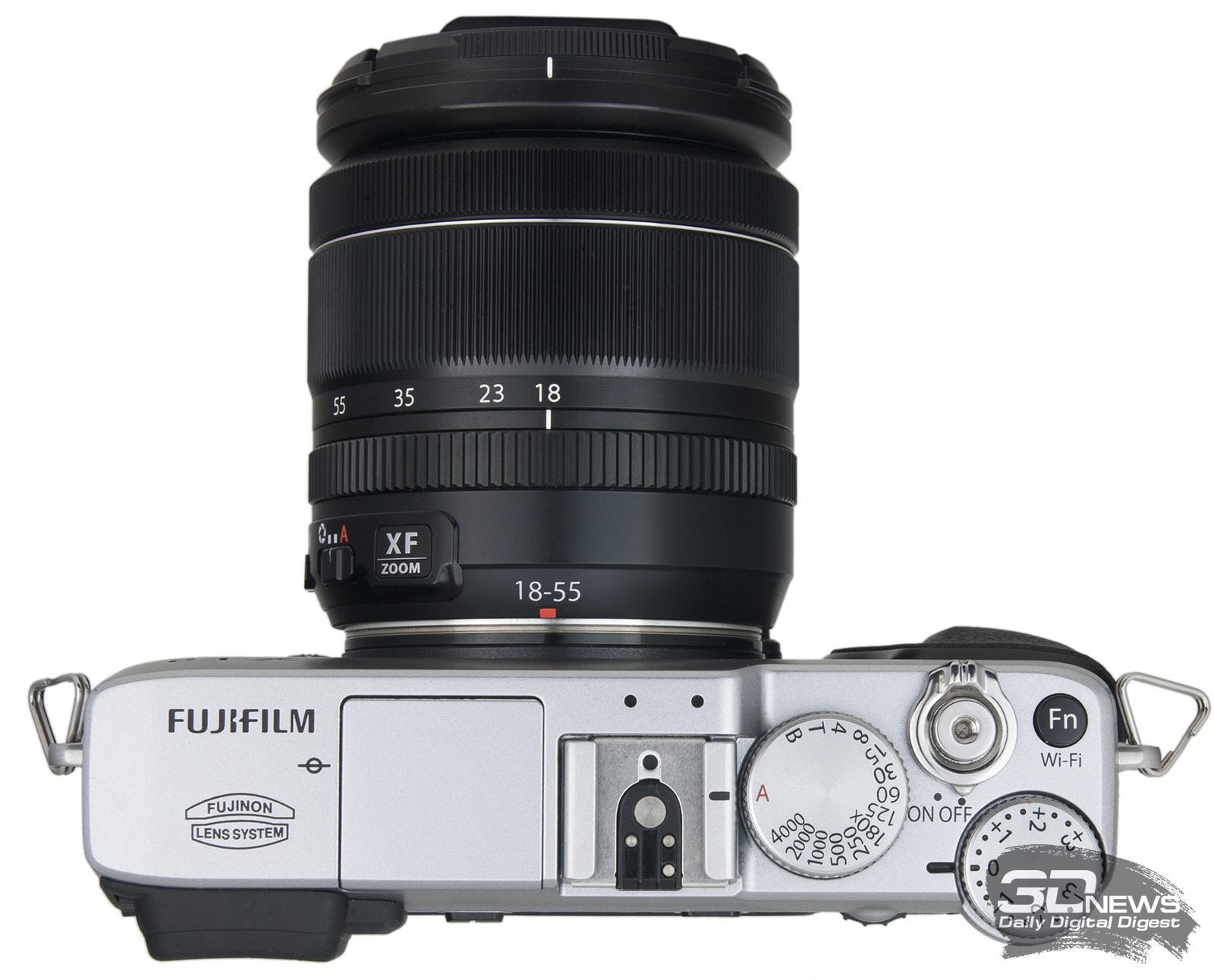 Сверху находятся подъёмная вспышка, «горячий башмак» с парой микрофонов в основании, диск установки выдержки с шагом в одну ступень, диск введения коррекции экспозиции с диапазоном от -3 до +3 ступеней (у предшественницы -2…+2 EV), программируемая клавиша Fn1, а также клавиша спуска затвора с рычажком питания. Она, кстати, может похвастаться возможностью подключения спускового тросика, что для ретро-камеры является большим плюсом — это не только удобно, но и придаёт новинке некий шарм. Впрочем, Fujifilm любит использовать спусковой тросик даже в своих гиперзумах, которые не предназначены для любителей ретростиля.