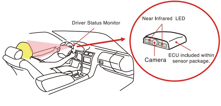 Driver Status Monitor — это небольшое устройство, которое монтируется в верхней части на приборном щитке, над спидометром, тахометром и другими бортовыми индикаторами. Монитор состоит из камеры с инфракрасной светодиодной подсветкой и электронного управляющего блока.