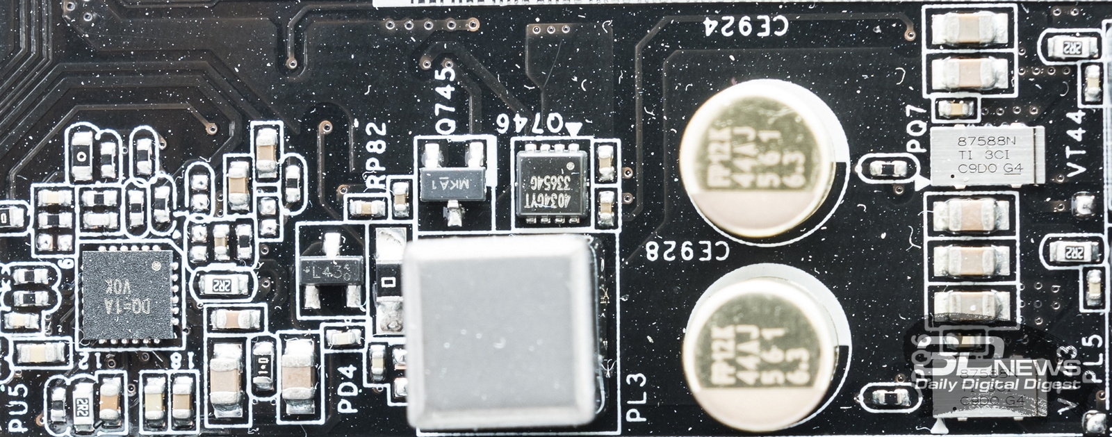 Взгляд с обратной стороны материнской платы позволяет увидеть, что ко второму полноразмерному слоту PCIe подведены восемь линий, значит с полноценной поддержкой CrossFire и SLI проблем не возникнет. По краю платы прерывистой нитью прошла изолирующая дорожка свободного текстолита — это одна из составляющих технологии Purity Sound 2, позволяющая снизить влияние остальных компонентов материнской платы на аудиотракт. Кроме этого, около сокета можно разглядеть три микросхемы, очевидно, принимающие участие в организации питания процессора. К ним мы вернемся немного позже.