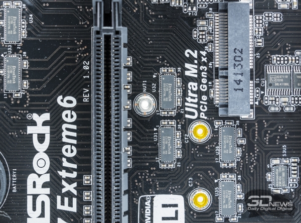 В первую очередь упомянем так называемый Ultra M.2 (M2_1). Возможность получить четыре линии PCI Express 3.0 непосредственно от процессора очень нечасто встречается на рынке, равно как и накопители, способные задействовать почти 32 Гбит/с, которые он может предоставить. На данный момент максимальную скорость можно получить при помощи Samsung XP941, но и ему (четыре линии PCIe 2.0) оказывается не под силу раскрыть весь потенциал разъема. В общем, Ultra M.2 оказывается отличным заделом на будущее, даже несмотря на то, что основная видеокарта при установке подобного накопителя переключится в режим x8, а дополнительная — в x4. Из положительных моментов — ценой нескольких отверстий в текстолите список поддерживаемых форм-факторов накопителей для обоих разъемов M.2 представлен сразу пятью величинами: 2230, 2242, 2260, 2280 и 22110. Напомним, что первые две цифры — ширина, а следующие за ними — длина модуля в миллиметрах.