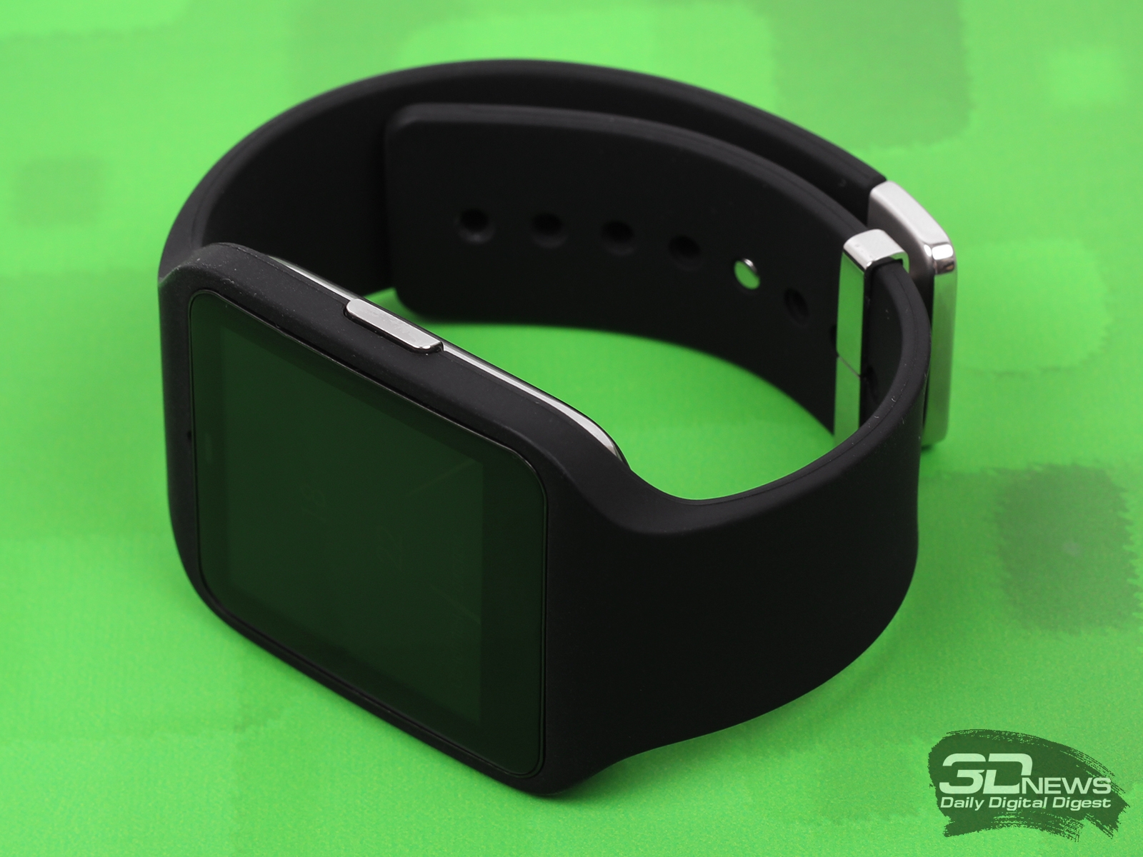 К материалам придраться сложно: лицевая панель часов полностью покрыта фигурным стеклом — с чуть сглаженными краями. Разумеется, олеофобное покрытие и добротный антиблик прилагаются. Задняя панель корпуса — металлическая. Та ее часть, которая непосредственно прилегает к руке, сделана матовой, более приятной на ощупь, а боковые участки заполированы. Поверхность браслета бархатистая — но по тактильным ощущениям ремешок LG G Watch и браслет Sony SmartBand первого поколения нам понравились больше, в этот раз у японцев получилось немного грубовато.