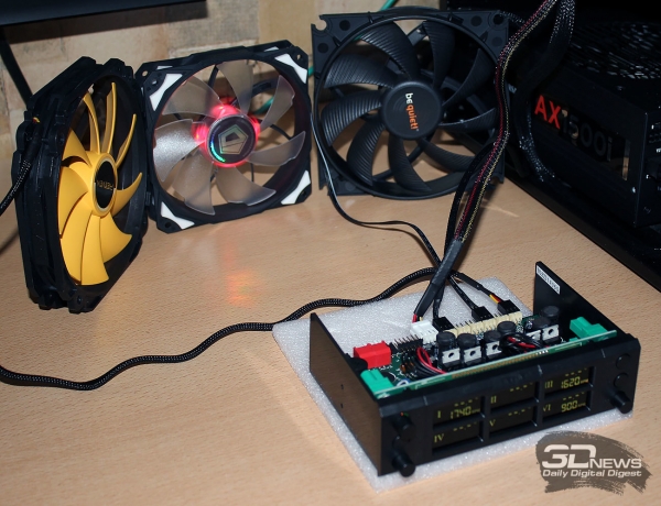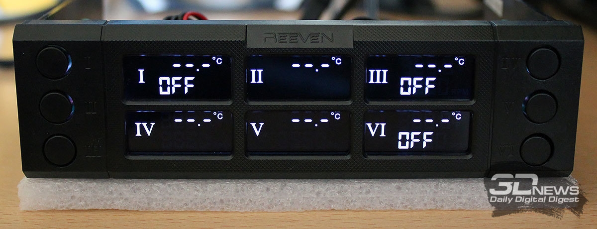 Проверку функциональных возможностей панели Reeven SIX EYES II мы осуществляли, не встраивая её в корпус. Ко всем каналам регулировки вентиляторов поочерёдно подключались три различных 120- и 140-мм вентилятора.