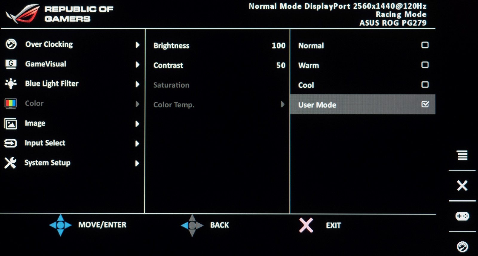 Изменить яркость, контрастность, цветовую температуру и насыщенность можно в разделе Color. От настроек тона кожи, динамической контрастности и прочих ненужных функций инженеры ASUS избавились.