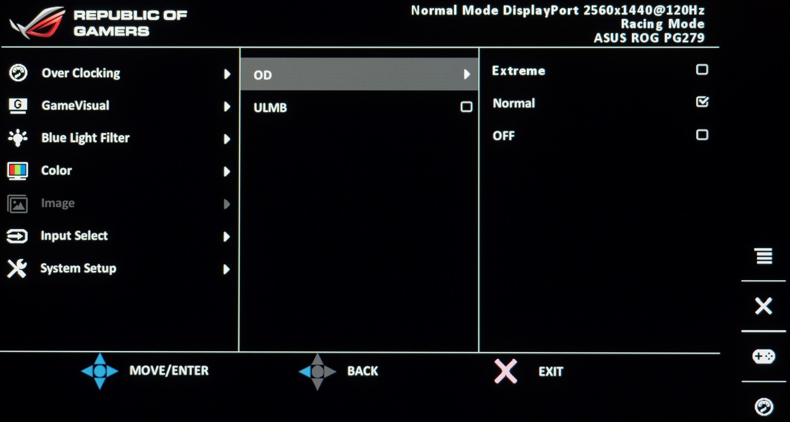 Заметны изменения к лучшему и в разделе Image. В нём находятся настройки ULMB и изменение режима разгона матрицы OD (прощай, старое название TraceFree). Теперь есть три конкретных положения OverDrive, оптимальным из которых по-прежнему является выставленное по умолчанию. Изменение OD при активном ULMB недоступно.