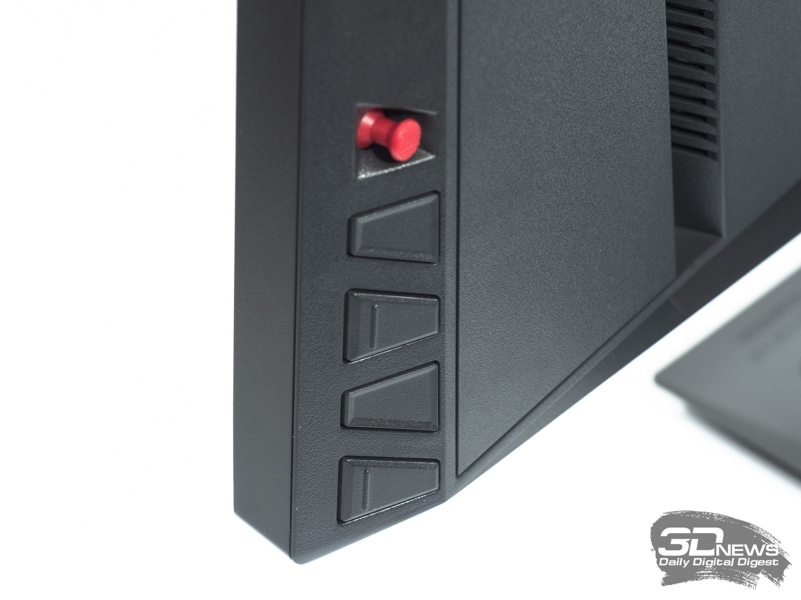 Управление монитором происходит с помощью четырёх трапецевидных физических клавиш и одного пятипозиционного джойстика красного цвета, расположенных в задней части устройства. На нижней грани разместился неяркий белый светодиод питания, который нельзя отключить.
