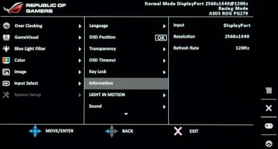 Раздел System Setup содержит в себе параметры, не связанные с качеством изображения на экране. Среди доступных опций — изменение громкости акустической системы, настройка внешнего вида и положения OSD-меню, включение подсветки LIGHT IN MOTION, выбор языка локализации меню (есть и русский), блокировка клавиш управления. Присутствует подраздел с основной рабочей информацией по монитору и функция сброса всех (!) настроек меню к значениям по умолчанию. Возможна деактивация глубокого сна при работе монитора с HDMI- и DP-портами. В этом случае после ухода в сон PG279Q при нажатии клавиши на клавиатуре или взятии мышки в руку выходит в рабочий режим буквально за полсекунды.