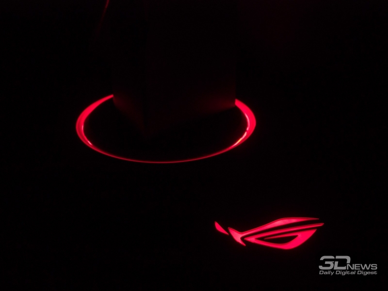 Система внешней подсветки LIGHT IN MOTION озаряет красным светом логотип ROG и нижний контур центральной колонны. Её работа по глазам не бьёт, но и толку особого нет. Разве что красоты ради — да и только.