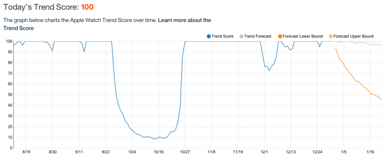 «Облачный» сервис IBM Watson Trend определяет с учётом множества факторов насколько желанным является для пользователя тот или иной продукт. Согласно шкале Trend Score, часы Apple Watch набрали максимальное количество баллов среди всех устройств — 100. Впрочем, справедливость оценок IBM Watson Trend вызывает некоторые сомнения, так как смартфон iPhone, например, получил в рейтинге всего 10 баллов, хотя его продажи за последний квартал, по оценкам экспертов, в 10 раз превысили количество проданных часов Apple Watch.