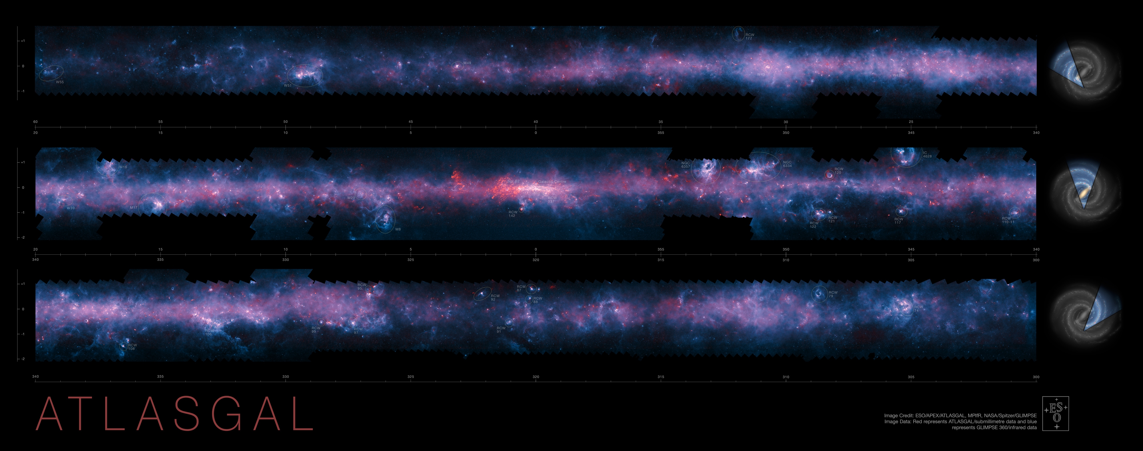 Инициатива ATLASGAL (APEX Telescope Large Area Survey of the Galaxy) — это совместная работа Института радиоастрономии Макса Планка (MPIfR), Института астрономии Макса Планка (MPIA), ESO и Университета Чили. Проект реализован с помощью телескопа APEX (The Atacama Pathfinder Experiment), расположенного на плато Чахнантор в высокогорной пустыне Атакама в Чили.