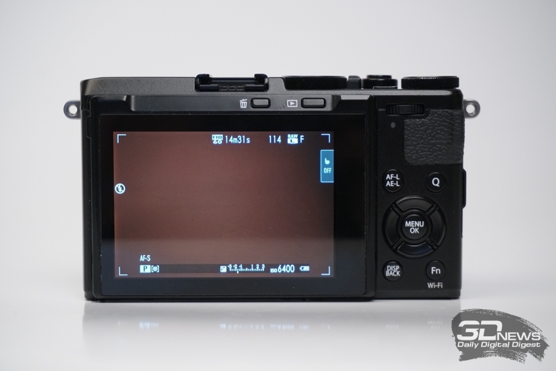 На тыльной панели расположен наклонный сенсорный дисплей, над которым удалось разместить клавиши управления снимками: воспроизведение и удаление; справа от него – трехпозиционный навигационный джойстик; пятипозиционная клавиша с программируемыми лучами и центральной частью, всегда отвечающей за вызов основного меню и подтверждение действия; четыре кнопки, отвечающие за блокировку автофокуса, вызов быстрого меню, смену типа отображаемой на экране информации и вызов Wi-Fi. Программируется из них только последняя.