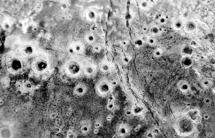 В общей сложности запечатлённый регион насчитывает несколько десятков кратеров разного размера. Самый крупный из них имеет в поперечнике около 50 км.