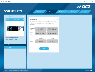 Накопители компании OCZ традиционно снабжались весьма функциональной сервисной утилитой SSD Guru. Toshiba постаралась перенести это качество и на накопители, которые теперь продаются под её брендом. В рамках ребрендинга сервисная утилита теперь приобрела более ординарное название OCZ SSD Utility, но на её возможностях это не сказалось. Весь привычный набор инструментов остался на месте, и, что ещё более приятно, он полностью применим к Toshiba OCZ RD400, несмотря на то, что это не SATA-, а PCIe NVMe-накопитель.