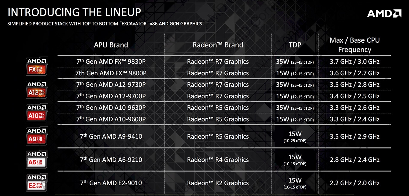 Максимальный уровень TDP процессора FX-9830P может быть задан производителем в пределах 25–45 Вт (номинальный TDP — 35 Вт), поэтому рабочие частоты APU пока можно указать только исходя из его официальных характеристик, где значится диапазон 3–3,7 ГГц. Графический блок Radeon R7 (512 шейдеров) функционирует на частоте 900 МГц.