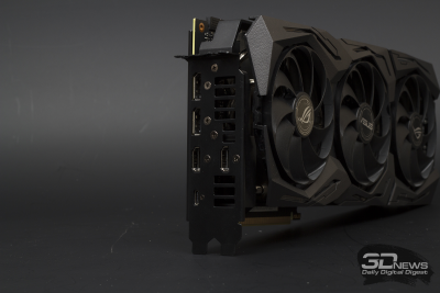 Подсистема питания видеокарты насчитывает 12 фаз, где 10 каналов отведено для работы GPU и еще два — для чипов GDDR6. Собственно говоря, поэтому ASUS ROG Strix GeForce RTX 2080 OC заметно выросла в ширину (130 мм вместо стандартных 100 мм) и не сможет поместиться в некоторые компактные корпуса. Длина ускорителя составляет 300 мм.