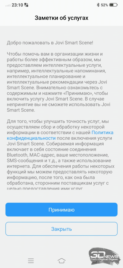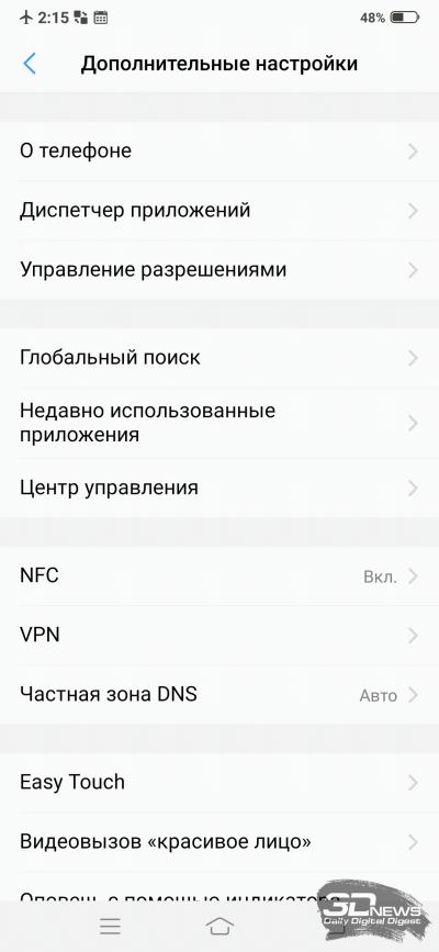 Работает Vivo V15 Pro под управлением операционной системы Android 9 с фирменной оболочкой Funtouch OS 9 (мода совмещать номера с актуальной ОС Google добралась и до творения Vivo). Серьезных изменений в сравнении с оболочкой Vivo NEX Dual Screens я не нашел. Тот же вызывающий легкую аллергию набор фирменных приложений (i Theme, i Manager, i Music), шторка панели уведомлений, которую надо спускать сверху, и шторка настроек, которую надо поднимать снизу (и делать это по-прежнему не слишком удобно). Проблемы с переводом все еще встречаются (игровой режим называется «Игровая коробка», например), а к шрифтам и оформлению я, пожалуй, попросту уже привык, хотя не сказал бы, что они тут особенно хороши. Работает оболочка Vivo V15 Pro тем не менее быстро и стабильно – за время двухнедельного тестирования сколько-нибудь критичных ошибок и зависаний не было.